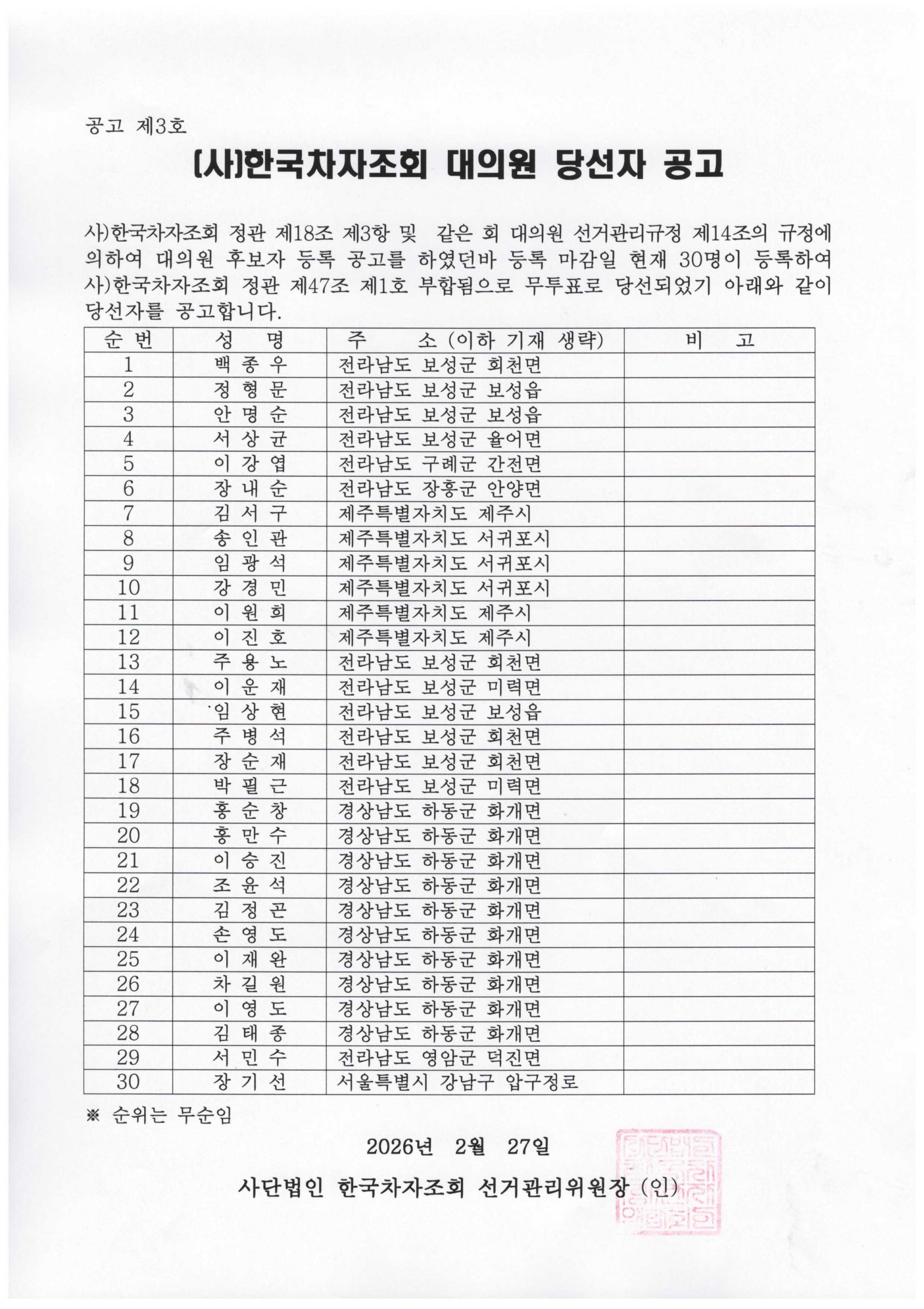 2026³âµµ »ç´Ü¹ýÀÎÇѱ¹Â÷ÀÚÁ¶È¸¼±°Å°ü¸®À§¿øÈ¸ ´ëÀÇ¿ø ¼±°Å°ø°í